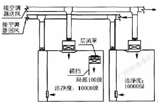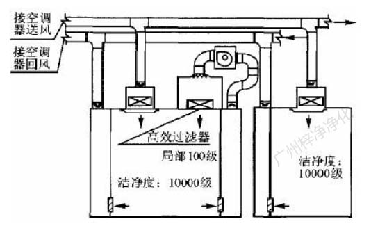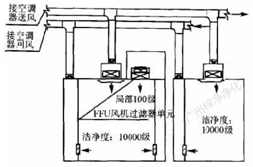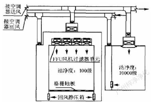 此方式的缺點(diǎn)是設(shè)置循環(huán)風(fēng)機(jī)箱及處理噪聲,需要較大的空間,而通常百級(jí)區(qū)周圍風(fēng)管都比較密集,需要精心布局。此方式百級(jí)區(qū)上部靜 壓箱相對(duì)百級(jí)區(qū)室內(nèi)為正壓,頂棚高效過濾器與吊架間的滲漏,為靜壓箱流向室內(nèi),直接影響百級(jí)區(qū)潔凈度。對(duì)施工質(zhì)量要求較高。(具 體可參考: