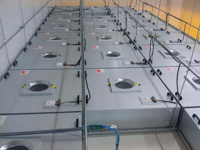 FFU的風機一般為幾臺甚至幾十臺并聯(lián)使用,當設計時要考慮FFU噪音的疊加,保證《潔凈室廠房設計規(guī)范中明確規(guī)定“潔凈室內的噪音級(空態(tài)),非單向流潔凈室不應大于60dB,單向流、混合流潔凈室不應大于65dB”的要求。因此在選擇風機時選擇高性能、壓出式、直驅后徑向葉片風機,這樣可以降低整體噪音。