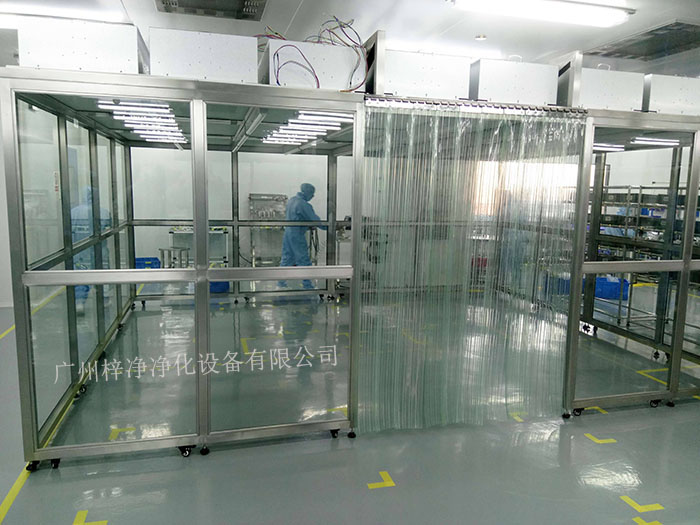 潔凈棚它主要從FFU頂部將空氣吸入,經(jīng)初效過濾器,高效過濾器過濾,過濾后的潔凈空氣在整個(gè)出風(fēng)面以0.45m/s±20%的風(fēng)速勻速送出到潔凈棚內(nèi)。形成均流層,使?jié)崈艨諝鈿饬鞒蚀怪眴蜗蛄?,從而保證了工作區(qū)內(nèi)所要求的潔凈度。潔凈棚等級(jí)通常分為百級(jí)潔凈棚,千級(jí)潔凈棚,萬級(jí)潔凈棚。